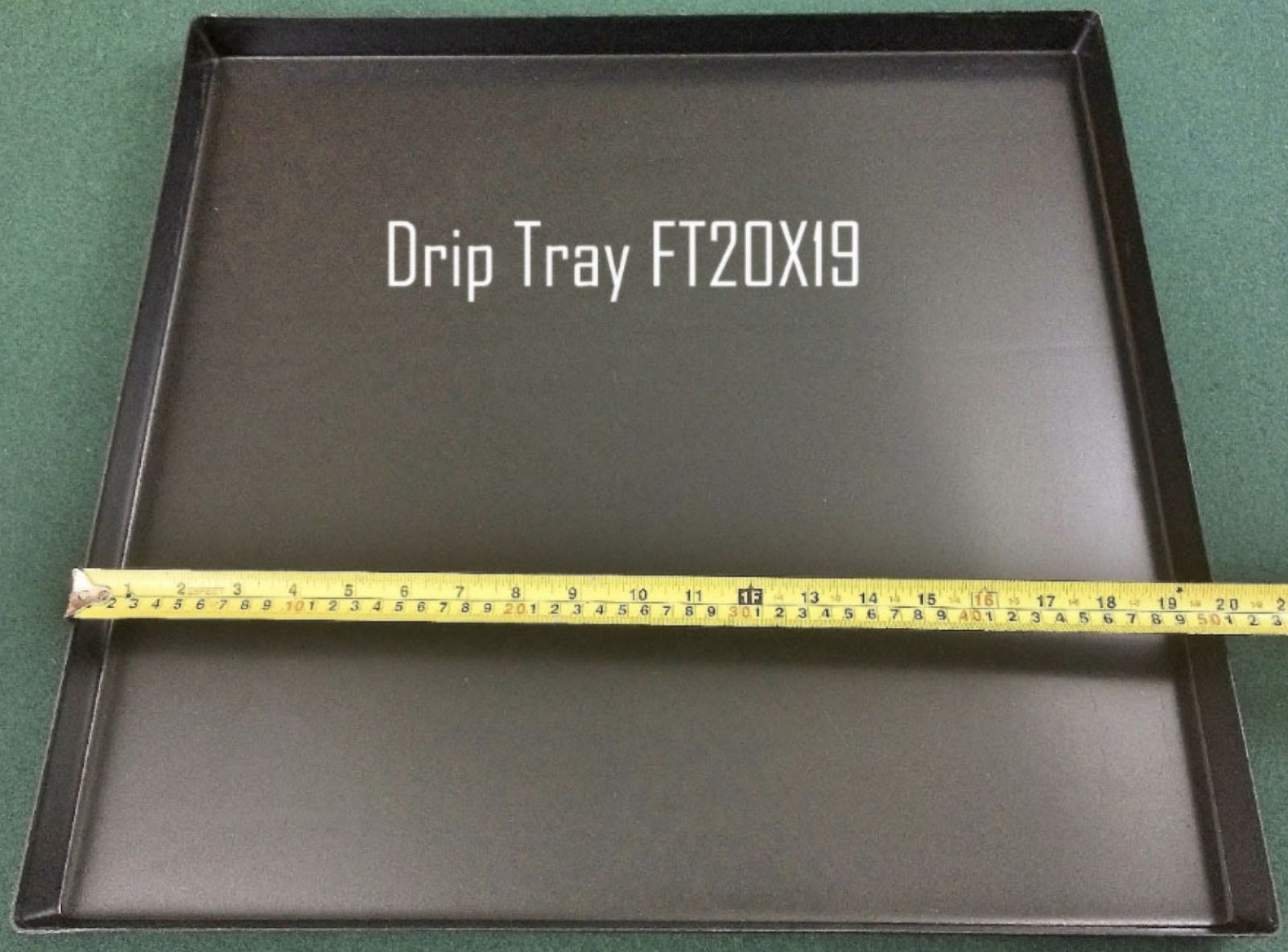 The most common size drip tray for refrigerators is the 20” X 19” tray. This tray is available in 1.1” depth or 1⁄2” depth. The depth is largely dependent on the door and how high the feet are extended. The 1⁄2” size is made for the refrigerators with little clearance.